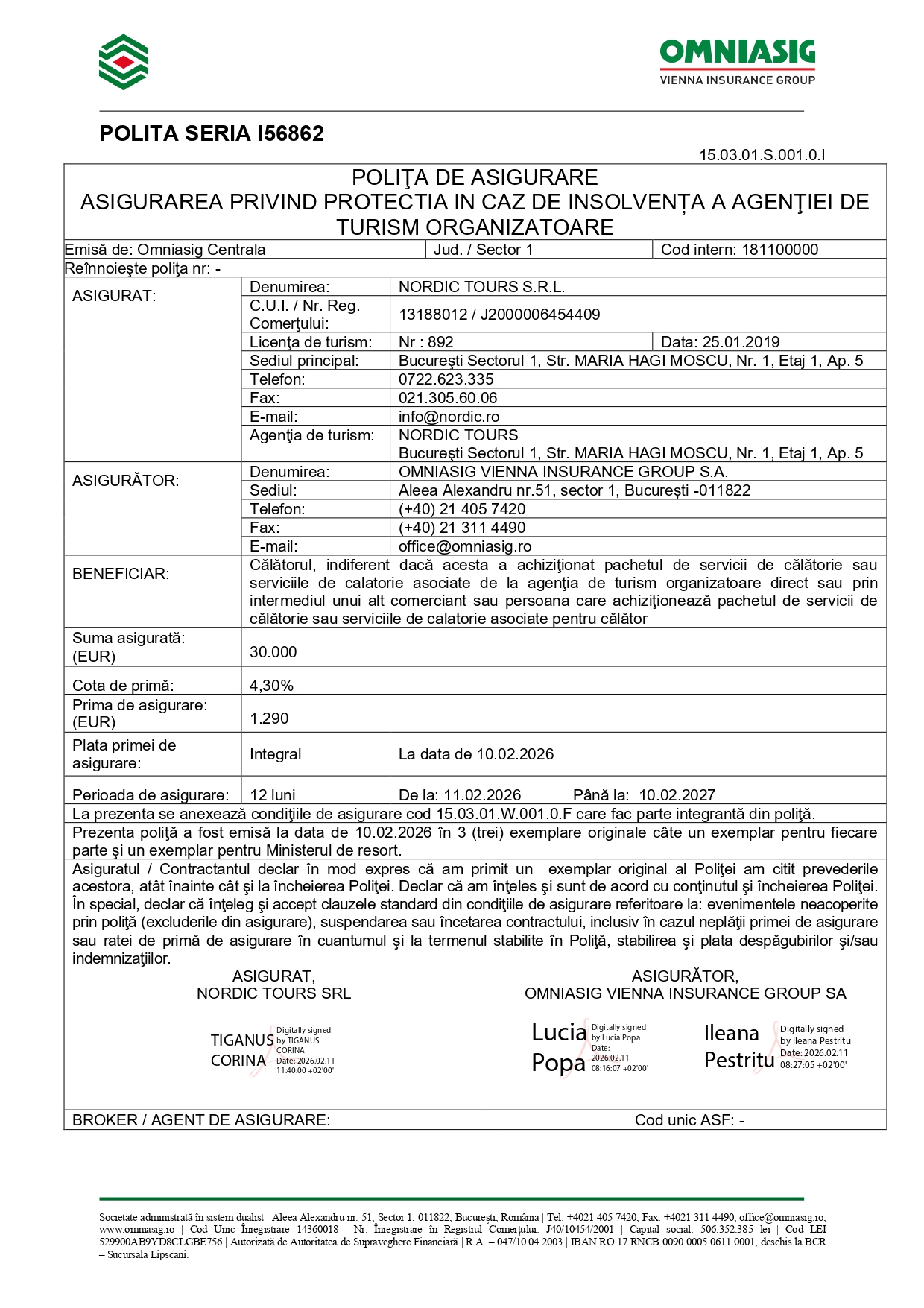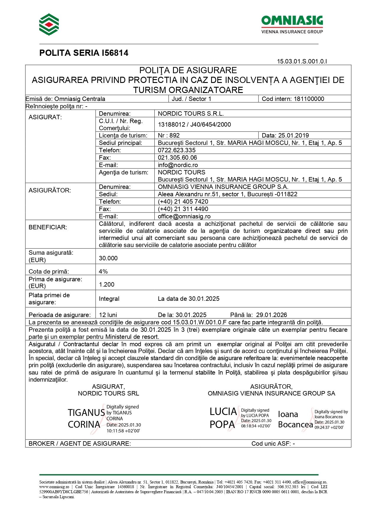 Polita de asigurare OMNIASIG: seria I, nr 56814/30.01.2025 valabila pana la 29.01.2026