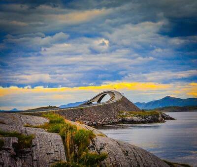 Drumul Atlanticului este o sosea spectaculoasa de aproximativ 8 kilometri, construita peste mai multe insule si legata prin poduri. Nu este doar un drum obisnuit, ci o experienta vizuala: marea este mereu aproape, iar peisajul se schimba in functie de vreme. Podurile au forme interesante, unele curbate, care dau senzatia ca drumul se ridica si coboara peste valuri.